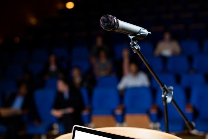 - Кликер и микрофон. Даже если в зале 15 человек, петличка позволит спикеру двигаться свободно, а запись звука будет качественной для последующего рилса или YouTube-ролика.