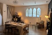 Есть тарелки, вилки/ножи/ложки на 18 персон, стаканы и бокалы. За отдельную плату винтажные чайные пары